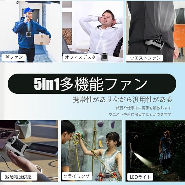 【5in1多機能ファン】:携帯性がありながら多機能です。ベルトやパンツに取り付けて体を冷やすためのウエストハンギングファンとして、また夏の旅行中に手を自由にするための首掛けファンとして使用することができます。さらに、モバイル電話を直接充電するためのモバイルバッテリーとして、LEDライト、SOSライト、デスクトップファン、ネックファンとしても使用することができます。