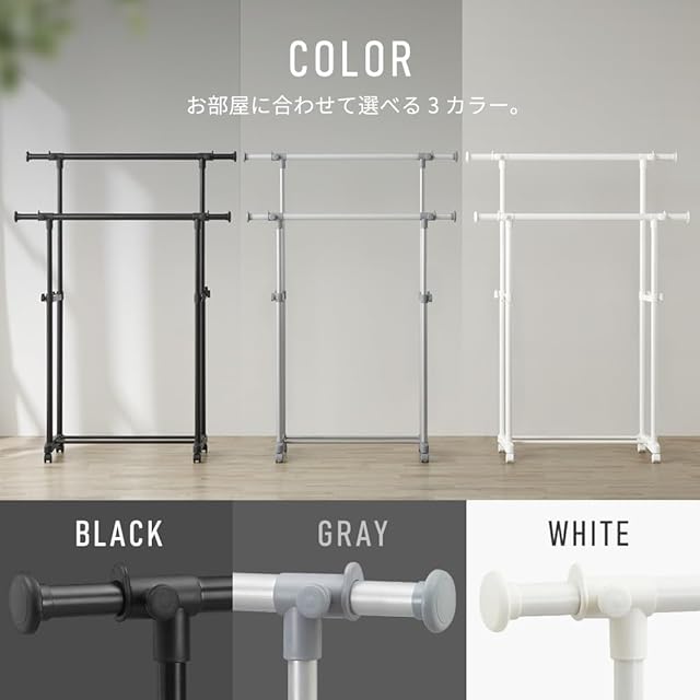 無段階調節で好きな高さに。89.5~150cmで高さ調節可能。子供服からどんぐこーとまで、ちょうどいい高さにピタッと調節。