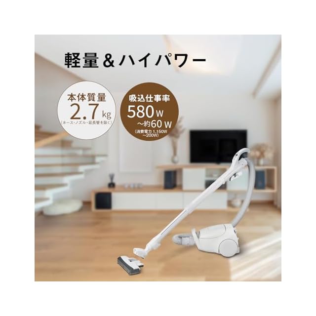 軽量コンパクトで取り回しがラク。吸込仕事率560W~約60W(消費電力1,150W~約200W)