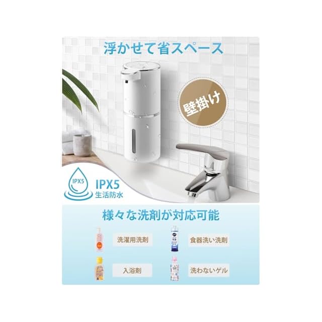 JEMISUN 洗剤ディスペンサー ハンドソープ 自動 液体 食器用洗剤 詰め替え 持続液出し380ml 壁掛け 吐出量4段階調節 充電式 IPX5防水 オートディスペンサー 食器洗剤 ディスペンサー キッチン 洗面所などに適用 日本語説明書付き