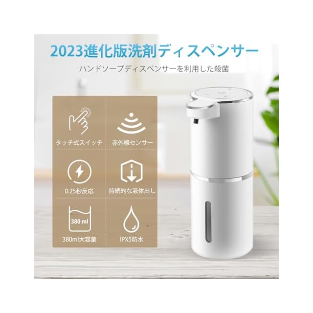 【380ml容量&IPX5防水】容量は380mlで、たっぷりと使えます。高品質なABS材料を採用しており、長くご利用いただけます。詰め替え用のソープを補充する際も、開口部がろうのような形状になっているため、簡単に行うことができます。透明な窓が付いているため、液体石鹸の残量が一目で確認できます。防水仕様でIPX5規格に適合しており、キッチンや洗面所などの水回りでも使用できます。
