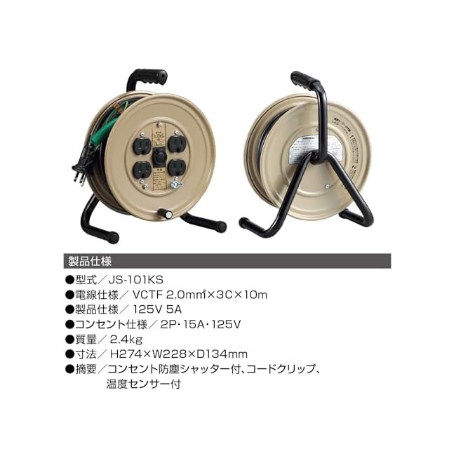 【特徴】コンパクトなボディにプロ用キャブタイヤケーブルを採用した、軽作業や手狭な現場用の本格派小型リール(10m)。業務用としてはもちろんご家庭でも使用可能。プラグはアースピンのスライドにより2P/2P接地付コンセントのどちらにでも接続できる「フキュートビプラグ」を採用。電線の溶解・焼損事故を防ぐ温度センサー付(自動復帰型)。コンセント防塵シャッター付でコンセント内部へのごみやホコリの侵入を防止。