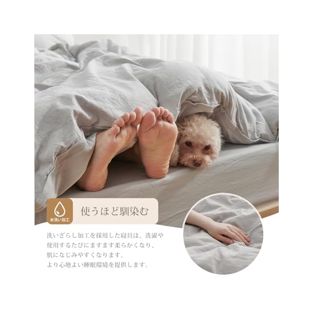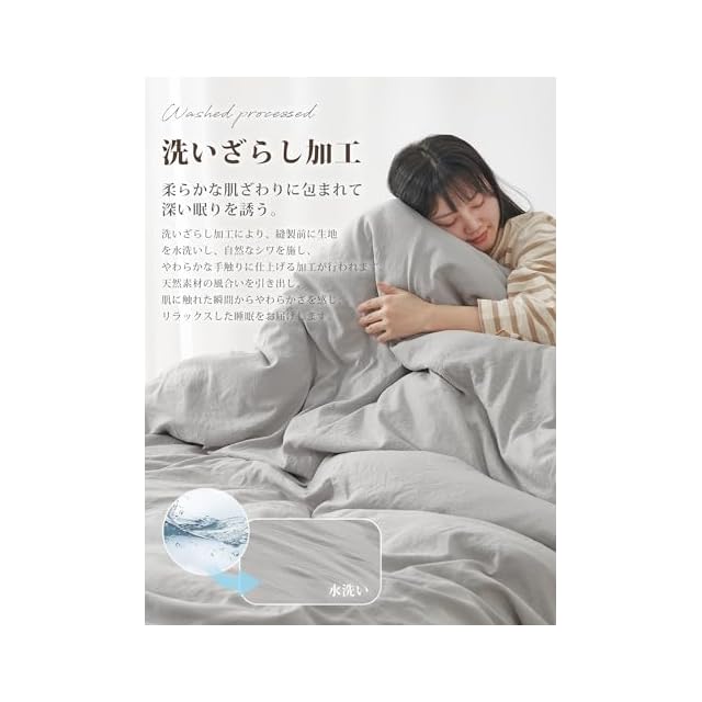 <洗いざらし&超柔らか肌触り>: 洗いざらしとは何度も洗って風合いが自然になったもの。お使いいただく初めから自然な風合いや、やわらかな肌触りを楽しめるように「洗い加工」を施しています。この加工を施した寝具は、洗濯や使用するごとにさらに柔らかくなり、肌馴染みも良くなります。