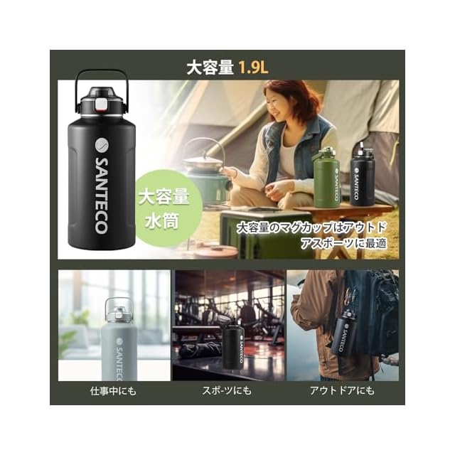 【広口・ストロー付き】この広口 1.9L ボトルは、一日中水分補給ができ、ハイキング、キャンプ、スポーツ活動に最適です。また、氷水、ホットコーヒー、スポーツドリンクなどの飲み物用のストローも付属しています。また、表面には冷たい飲み物を入れても結露しにくい「結露防止構造」も施されています。