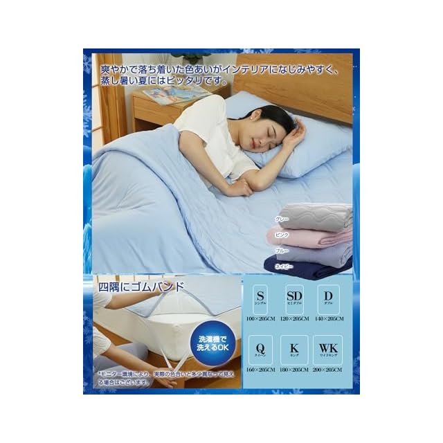 【究極冷感敷きパッド!】敷きパッドの表地には『強冷感』と『柔らかさ』を兼ね備えたスムース生地を使用。さらりとした触り心地で、暑い夜でも快適な眠りを提供します。第二層には透湿性不織布。 第三層には帝人の【マイティトップ Ⅱ】の中わたを使われ、抗菌防臭効果で、臭いや細菌の繁殖を抑えます。第四層には特別開発した繊維の「吸水速乾」中わたが湿気を素早く吸収し、迅速に乾燥させるので、寝汗や不快な湿気を防ぎます。裏地には「爽やか」なリサイクルピーチ素材を使用し、快適な眠りをサポート。