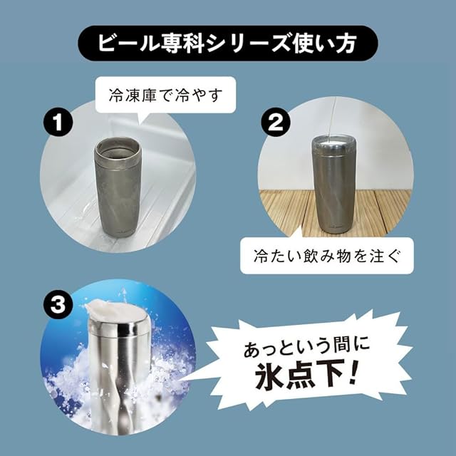 本体を冷凍庫で12時間以上冷やしたビールを注ぐ、冷蔵庫でよく冷やしたビールを注ぐ。かきまぜて約1分で氷点下。
