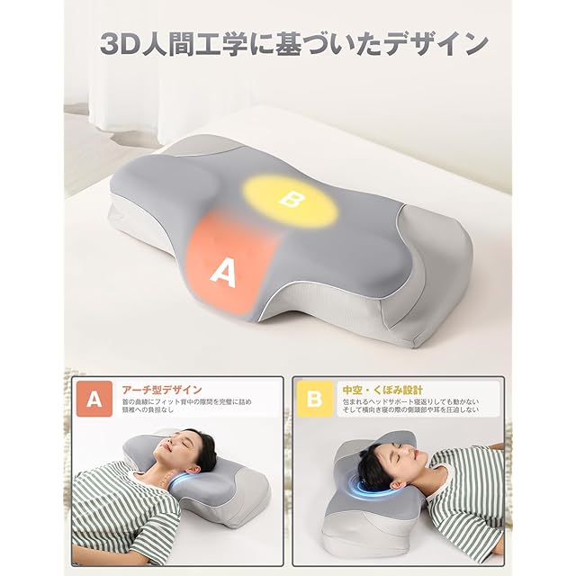【3D人体工学の立体デザイン】✅Tillmulyaまくらはカーブした立体形状で、首のラインに自然になじみます。これにより肩から背中にかけての空間をスムーズにサポート。✅ この枕は凹型の中空設計により、頭部をしっかりとサポートしながら包み込むような形状になっています。頭部への圧力がかからず、まるで無圧力のような寝心地を実現。横向き寝でも耳やこめかみに負担をかけません。
