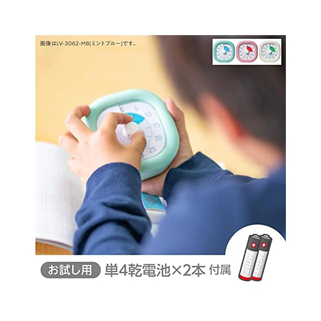 0時間の経過とともにフィルムが回転、色面が減っていくので、時間の経過を視覚的に実感できます。 時計が読めない、時間感覚がまだ身についていないこどもにもおすすめ。 カウントダウン終了を「ピピピッ♪」の電子音でお知らせします。カウントダウン中はカチカチ音が気にならない静音作動設計。 ダイヤルを回してセットするだけ! こどもでもカンタン操作♪ 持ち運び、収納しやすいサイズのコンパクトタイプ。見やすい角度で自立します。