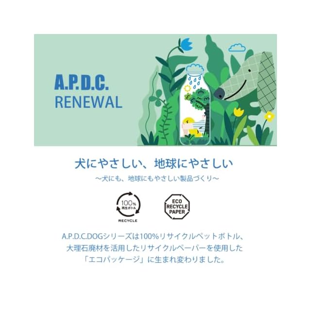 【リニューアルのご案内】~ 犬にも、地球にもやさしい製品づくり~■バージンプラスチックから100%リサイクルペットボトルへ。ペット業界では珍しいエコボトルの導入をいたしました。■パルプを使用した紙ラベルからリサイクルストーンラベルへ。原料に木材チップなどを一切使用せず、大理石廃材から抽出した無機鉱物粉末(80%)をリサイクル高密度ポリエチレンHDPE(20%)で固めた製品です。