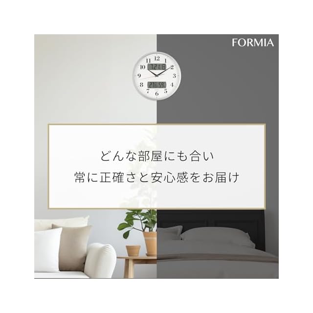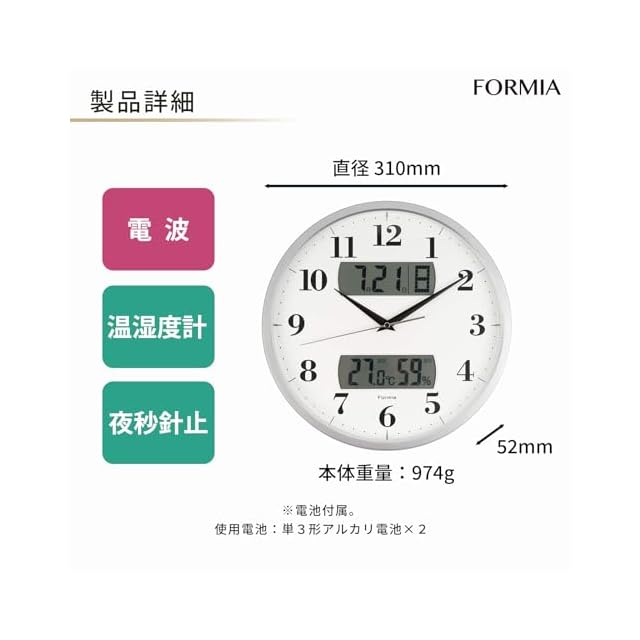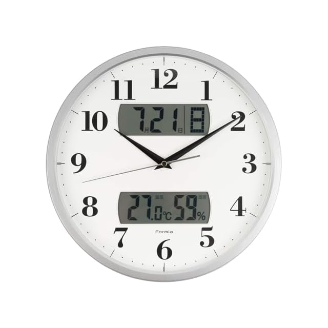 Formia(フォルミア) 掛け時計 時計 壁掛け 電波時計 温度 湿度 温湿度計 日付カレンダー 曜日 夜間秒針停止 静音 アナログ 保土ヶ谷電子販売 シルバー HWC-001RCSV