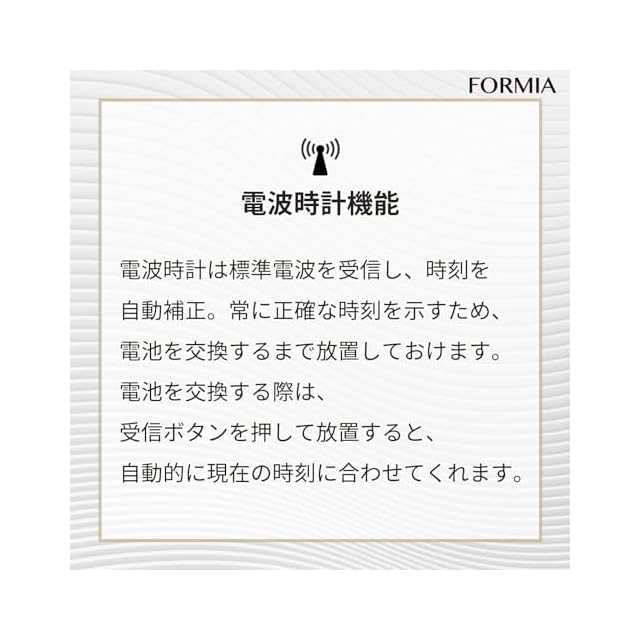機能:電波受信機能(自動受信、手動受信)、ライト常時点灯機能 (午後10:00~午前6:00)、ライト明るさ調整(強/弱/OFF)、夜間秒針停止機能 (午後10:00~午前6:00)、ステップ秒針