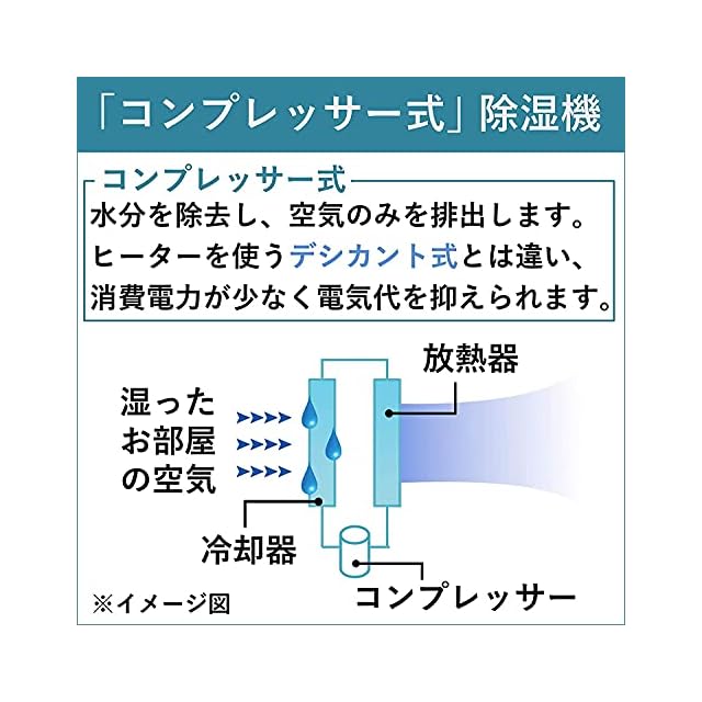 【コンプレッサー式でお得に除湿】省エネで使えるコンプレッサー式。1回あたりの衣類乾燥時間は約72分(※)、電気代は約18.6円( 電気料金目安単価31円/kWh(税込)にて試算)ととってもお得。しかもサーキュレーターを分離させた連動運転では乾燥時間をさらに短縮でき、電気代も抑えます。※除湿機の衣類乾燥性能は、一般社団法人日本電機工業会自主基準(JEMA-HD 090:2017)に基づき以下の条件のもとで試験を行った値です。試験条件/●部屋の広さ6畳●室温20℃湿度70%●洗濯物2kg相当●運転モード「衣類乾燥」運転60Hz地区。なお実使用時の衣類乾燥時間は使用環境・使用条件により異なります。