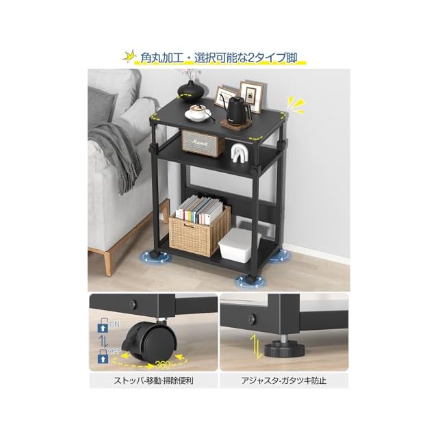必要に応じて使い分けが可能な脚部:CPUワゴンは四つの足に360°回転のキャスターが付いて、ラクラクに移動できて、掃除やメンテナンスに便利です。キャスターにはストッパーが付いて、デスクが滑るのを防ぎ、動かさない時もしっかりと止まって固定できます。がたつき防止のアジャスターも4つがついており、必要に応じて使い分けが可能。
