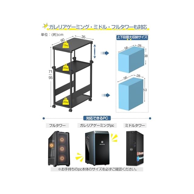 幅35×奥行60cm仕様の天板:天板サイズ幅35×奥行60cmで、広い置くスペースを確保できます。天板にプリンターがしっかりと置けます。下段にデスクトップpcの置き、中段にPS5を横置きで収納できます。