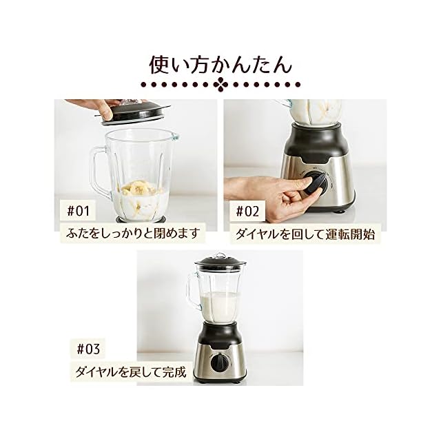 【操作方法】①具材を入れ、しっかりと蓋をします。②お好みでダイヤルを回して運転を開始します。③ダイヤルを戻して停止!完成です♪【ダイヤル3段階調整】①LOW:液体のみを混ぜるときに使用。②HIGH:液体と固形物を混ぜるときに使用。③FLASH:氷が入っているときや全体を瞬間的に混ぜたいときに使用。