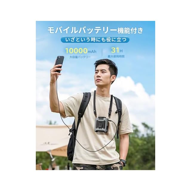 腰掛け扇風機 ベルトファン 10000mAh大容量【31時間連続使用&熱中症対策】5段階風量調節 USB充電式 携帯扇風機 首掛けLEDライト付き パワフル送風 暑さ対策 腰掛けクーラー 工事/配達/屋外作業/登山/キャンプ/アウトドア