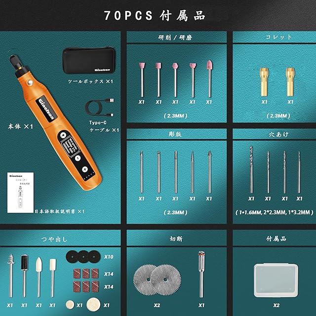 ✔【幅広い対応性70PCS付属品】Ginelsonミニルーターのパッケージに70個のビットと2個収納箱があり、交換用のビットが多くあるので、よくビットの購入が不要です。今回は2丸鋸刃、2フェルトホイールとカットオフホイールを追加いたし、彫刻/穴あけ/研磨/切断/切削/つや出し/マニキュア/汚れ落としなどの作業はちゃんとでき、1in8以上はもっと幅広く対応できます。
