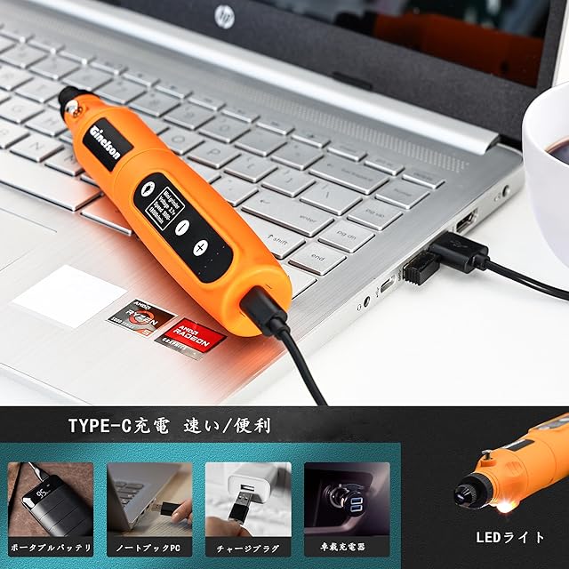 ✔【TYPE-C充電式&コードレス】こちらのミニルーターのモデルはコードレス式で、作業中に線に邪魔される心配しません。リチウム電池を採用し、TYPE-Cで接続して充電できます。電池容量は2000mAhで、3時間半の(無負荷)ずっと作業し続けられます。TYPE-C充電式なので、パソコン、アダプターやモバイルバッテリーに直接に接続すれば、充電できます。