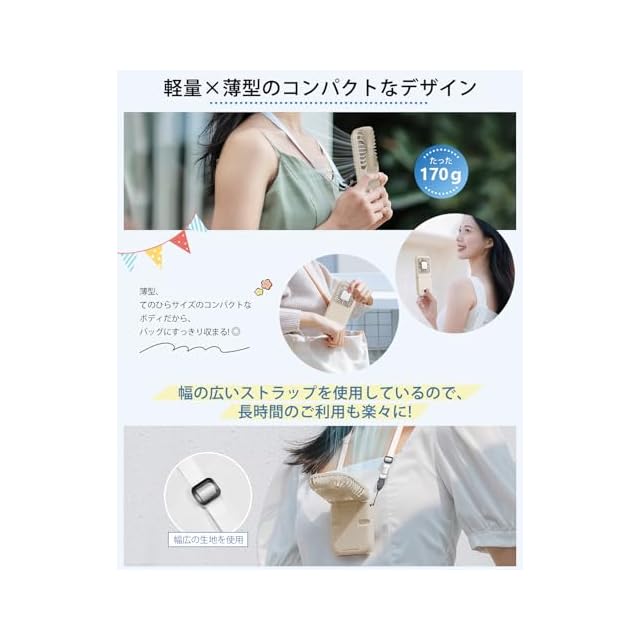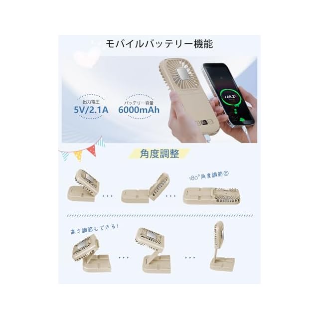 【よりコンパクトで持ち運びに便利&実用性抜群な「モバイルバッテリー」機能】約20mmの薄型ボディなら、小さなバッグやポケットにもすっぽり収まって携帯性抜群!コンパクトに2つ折りできるハンディファンなので、使用しない時は、引き出しや棚などの僅かなスペースに収納可能です。スマホより軽い約208g。長時間首にかけたり手で持って使用しても負担になりにくいです。さらに6000mAhのバッテリーとしてスマホの充電ができる!夏のレジャーは、キャンプや花火、海水浴など長時間のお出かけ時は電源の確保ができモバイルバッテリーとしても使えます。
