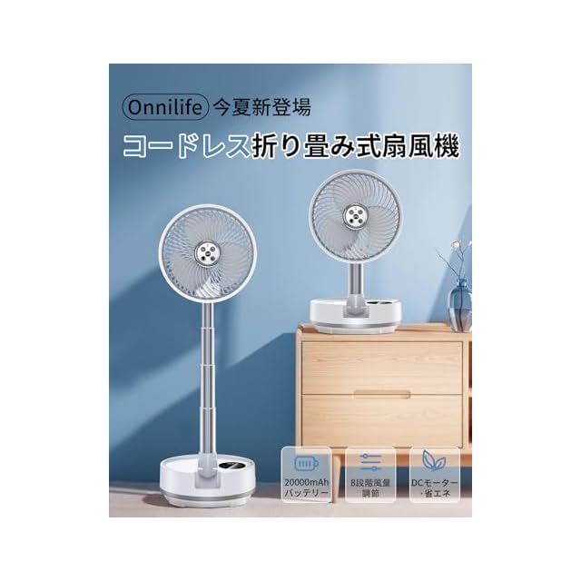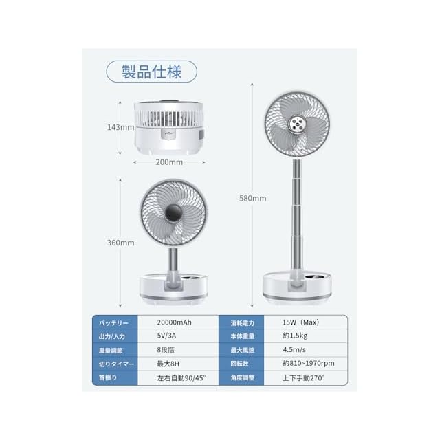 【製品仕様・12ヶ月・24Hサポート】●バッテリー:20000mAh(モバイルバッテリー機能付き) ●電源電圧:5V/3A ●風量調節:8段階 ●サイズ:20x20x14.3CM(折り畳む時) ●高さ調節:~58CM ●重量:約1.72kg ●Onnilifeでは、お客様の満足度No.1を目指しております。12ヶ月期間とカスタマーサポート(24時間以内対応)をご提供いたします。万が一初期不良などご満足頂けなかった場合、ご購入のショップからお問い合わせください。ご連絡の方法:「アカウントサービス」→「注文履歴」→「販売元」→「質問する」