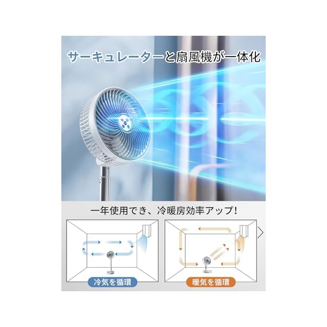 【サーキュレーターと扇風機一体化タイプ】扇風機のみでの使いやすさはもちろん、空気循環を行うさーきゅれーたーとしても使える2-in-1仕様です。サーキュレーター扇風機とエアコンを併用するタイプ、効率よく部屋の空気を循環させることで、室内の温度を均一に保てます。usb充電式ながら最大風速4.5m/sまでパワフル送風を実現!長時間肌にあたっても疲れにくい、やさしい微風まで自由自在!猛暑対策、梅雨、除湿、季節を問わず1年間フル稼働できる優れモノです。