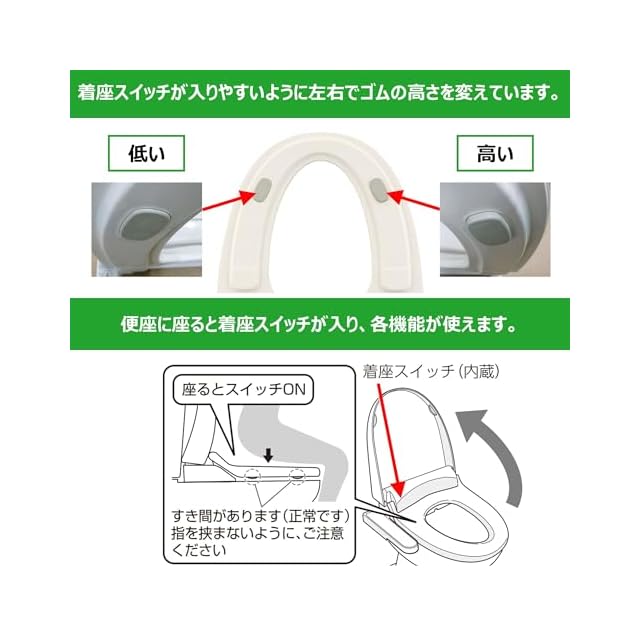 温水洗浄装置・おしり洗浄(ml/分):約500~670※2・ビデ洗浄(ml/分):約500~650※2・水勢調節:おしり、ビデ各4段階調節・温度調節:3段階調節(約34℃~40℃※2)、およびヒーター「切」・温水タンク容量(L):約0.6・安全装置:サーモスイッチ、温度ヒューズ、水位センサー