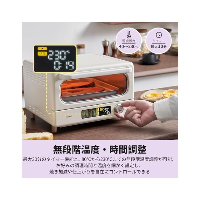 【商品仕様】COMFEE' オーブントースター:◇コンパクトなサイズ:幅36.4x奥行19.8x高さ20.7cm、約2.7Kg◇容量:8L、トースト2枚焼き ◇電源:AC100V ◇最大出力:1,000W ◇タイマー:最大15分◇加熱モード:遠赤外線◇温度調整範囲:80℃~230℃◇電源コード長さ:1.1m◇付属品:パンくずトレイ・受け皿・日本語取扱説明書※ 製品期間:一年間