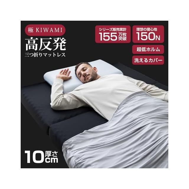 【極とは】 【極】高反発マットレスは、硬すぎず柔らかすぎない絶妙な硬さで、どんな寝姿勢にもフィットします。極厚10cmのウレタン素材が、体をしっかりと支えながらも、ふんわりとした寝心地を実現。三つ折り式で収納も簡単で、使わない時はコンパクトに折りたためるため、スペースを有効活用できます。