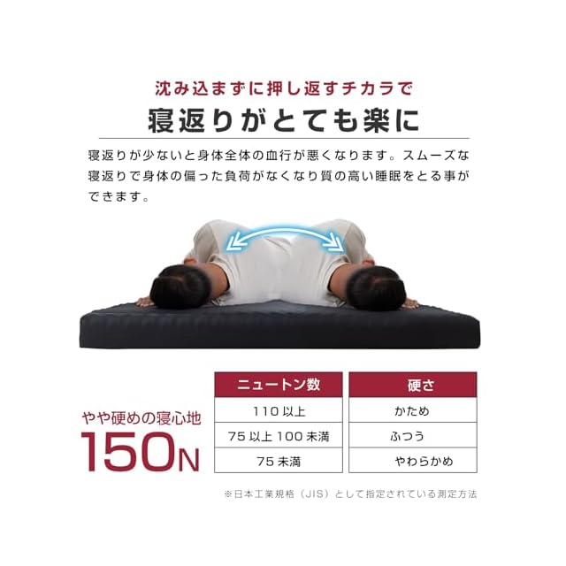 【サイズ】セミダブル/約120x195x10cm【仕様】三つ折極厚タイプ【硬さ】程よい硬さの150N【カラー】ブラック【素材】中材:特殊凹凸カッティング竹炭配合高反発ウレタンフォーム、カバー:伸びにくい布帛生地