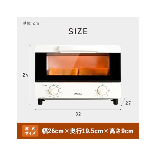 【商品仕様】◇本体サイズ:幅32×奥行27×高さ24cm ◇庫内有効寸法:26×奥行19.5×高さ9cm ◇本体重量:3.4kg ◇電源:AC100V(50/60Hz) ◇消費電力:1000W ◇タイマー:電源スイッチ兼用30分タイマー ◇温度調節:80~230度 ◇電源コードの長さ:1.1m ◇期間:お買い上げ日より1年間(の範囲については、取扱説明書をご確認ください。(一般家庭用以外(業務用など)に使用された場合の故障及び損傷などは対象外となります))