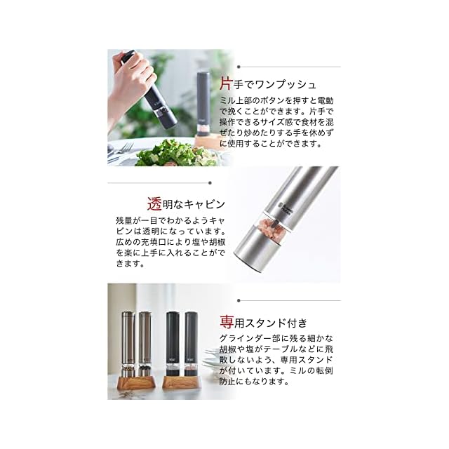 テーブルコーディネートや料理の味わいにプラスもできる、コンパクトサイズの電動ミル。