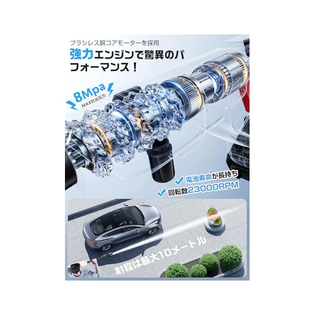 【8MPa喷射压力&洗車や大掃除に便利&3段階調節可能】高圧洗浄機はブラシや雑巾といったほかの掃除道具と異なり、水を当てるだけなのでラクに掃除ができる点が大きな魅力です。高圧洗浄機は強力な8MPa喷射压力によって、3段階水压モードがあり、射程は最大10メートル、長年蓄積したガンコな汚れを落とすことにもできます。オプションパーツは豊富で、自吸機能つきで汎用性が高く、小型のため持ち運びやすく、射を切り替える6in1ノズルや、洗車に便利な左右360°上下180°変換ノズル、フォームノズルが付き、扇型の水流で効率よく洗浄できます。車の下回り・雨どいなどの手の届きにくい場所の洗浄に適しています。一方、高圧ホースは接続しやすく、ノズルの先端を回転させることで6種類の水流を使い分けられる点は様々なシーンで大活躍!洗車や庭、屋外、階段、網戸・窓ガラス、ブロック塀、外壁、駐車場、玄関まわり、自転車・バイク、ベランダ、高い場所、家まわり、浴室、年末大掃除、キャンプ用品の清掃やBBQの片付けにも大活躍。