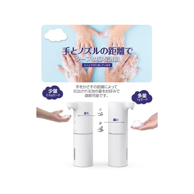 【ハンドソープ 自動 泡&2段階に調節可能】泡立てる手間が必要ないので、帰宅してからすぐに手を洗う習慣づけます。節水にはもちろん、お肌への残留も少なく手荒れ対策にもつながります。手をかざす位置によって、ソープの量を2段階調節することができ、量を少なくする場合はセンサーに手を近づけ、量を多くする場合は手を離します。感覚的な調節が可能です。