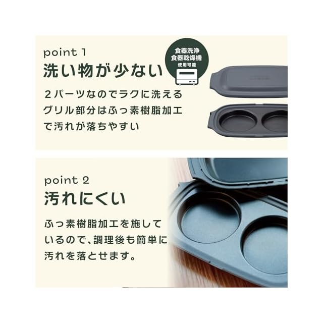 グリル部分は、ふっ素樹脂加工なので汚れが落ちやすく、2パーツで洗い物も少なく済みます。食器洗浄機対応なのでお手入れも簡単。