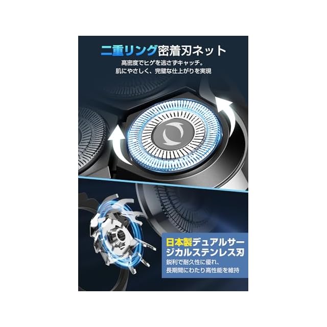 ✅【進化した剃り心地と深剃り性能】日本製デュアルサージカルステンレス刃を搭載した ひげそり 電動シェーバー 、毎分約16,000ストロークの高速リニアモーターでパワフルにヒゲをカット。二重リング密着刃ネットが高密度にヒゲを捉え、肌に優しく、 シェーバー メンズ として最高の深剃り体験を実現。 髭剃りおすすめ ランキング常連の性能で、頑固なヒゲも一発で処理。 電動ひげそり メンズ をお探しの方に最適な 電動髭剃り です。