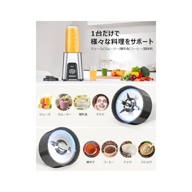 【操作簡単】小型ミキサーはカップを押すだけで簡単に操作できます。わずか10~60秒で手早くお気に入りの飲み物を作ることができます。蓋も付いているので、蓋をつければ、冷蔵庫で保管したります。そして、ハンドブレンダーより安全でケガをする恐れもございません。また、飛び散りもいりません。初心者でも簡単に操作できます。小型ミキサーは取り外し可能な6枚刃カッターとS字型ブレード付き、食材の硬さに合わせて調理できます。毎日簡単かつ健康的な生活を続けられます。
