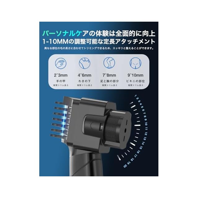 バリカンのアクセサリー: 毎分7200RPM回転する強力なモーターを搭載され、パワフルで切れ味の良いです。特別に設計したトリマーアクセサリーを使用して、トリミングの長さを微調整することができ、体のいろんなエリアの毛を正しくとかすことができます。(トリミングするときに敏感なところに追加の保護を提供して、トリミングの精度をアップしました)。体毛を思い通りにデザインします。長さの調整器(1-10mm)*1、肌保護装置*1(2mm)、3種の長さとヘアカットアクセサリー(1mm、2mm、3mm)を含んでおります。