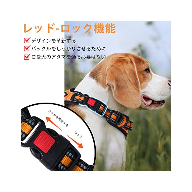 【引っ張り防止&ロック機能バックル】:胸元の金属のDリングっかにリードを通しただけで、犬が引っ張ると、あなたの方を向いて向きを変えるので、すぐに引っ張りをしなくなります。引っ張り癖が弱くなることができます。首のバックルはロック機能があります(赤い部分)。ロック状態で抜けないで、ご愛犬を保護のため、「アンロック」に簡単に抜けます。しっかりとした作りでワンコが守られてます!