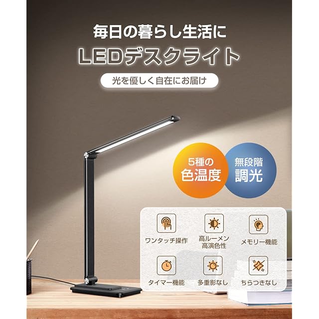 【2025革新モデル】 デスクライト LED スタンドライト 目に優しい 電気スタンド 省エネ 卓上 調色5段階 無段階調光 明るい ブックライト タッチセンサー 多角度調整 読書灯 折り畳み式 コンパクト 簡単操作 USB給電式 メモリー機能 タイマー テーブルライト USBポート 台灯 寝室/勉強/仕事/学習机 type-C(ブラック)