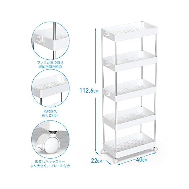 SPACEKEEPER キッチンワゴン スリム 隙間収納 22cm 収納ラック キャスター付き 収納カート ローリングラック おしゃれ 調味料 食品 ペットボトル 小物 台所 洗面所 冷蔵庫横 5段 ビッグ ホワイト