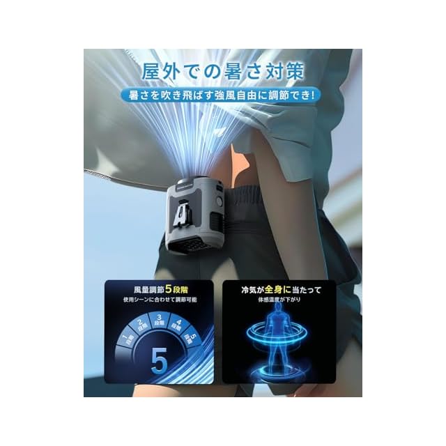 【5段階風量調節&16000RPM高速回転】およ風のような微風から暑さを吹き飛ばす強風まで使用シーンに合わせられるよう細かく5段階設定できるベルトファンです。この腰掛けファンは最大16000RPMの高速ブラシレスモーターを搭載され、高速回転で気流を促進し、かなり強風で腰につけても顔まで風がくる風力で、酷暑の屋外でも一瞬で涼しくなります。この携帯扇風機は高温環境下で強風を必要とする作業者にとって不可欠なアイテムです。