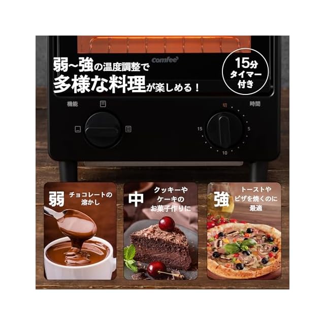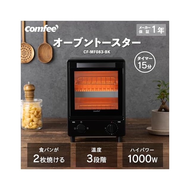 【商品仕様】COMFEE' オーブントースター:◇コンパクトなサイズ:幅36.4x奥行19.8x高さ20.7cm、約2.7Kg◇容量:8L、トースト2枚焼き ◇電源:AC100V ◇最大出力:1,000W ◇タイマー:最大15分◇加熱モード:遠赤外線◇温度調整範囲:80℃~230℃◇電源コード長さ:1.1m◇付属品:パンくずトレイ・受け皿・日本語取扱説明書※ 製品期間:一年間