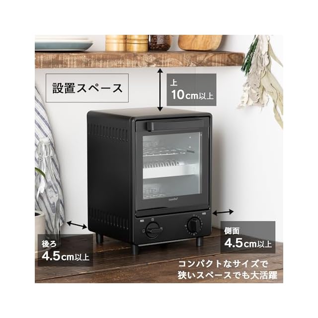 【一人暮らしに最適】本オープントースターは全体的にコンパクトですが、庫内には2枚のトーストを同時に焼けるだけのスペースがあります。レンジ台にも設置できる省スペース設計になっています。
