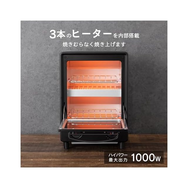 【ムラ少ない火力調整】トースター本体のヒーターは、上・中・下と3本あり、1段だけでも2段だけでも、つまみを回してヒーターを調整すれば、しっかりと熱を通し、均等加熱が可能です。また最大15分のタイマーも付いて、焼き焦げを防ぎます。