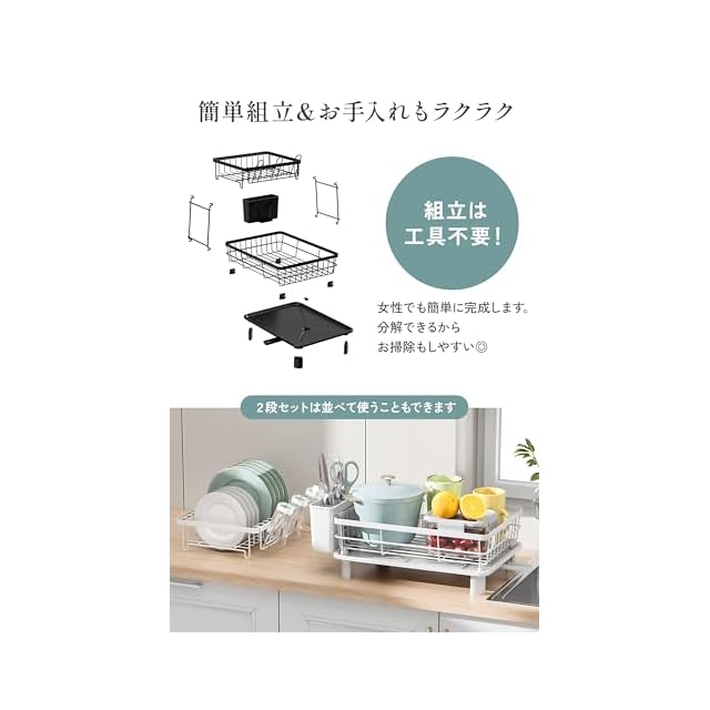 【組み立て簡単&使いやすい】シンプルな構造の食器用水切りかごなので、組み立ても簡単。色はホワイトとブラックをご用意。ご自宅のキッチンの雰囲気に合わせてお選びいただける水切りラックです。さらに、分解して洗えるので、お手入れもラクラク。キッチン用水切りとして長く愛用でき、毎日の洗い物を快適にする食器ラックです。