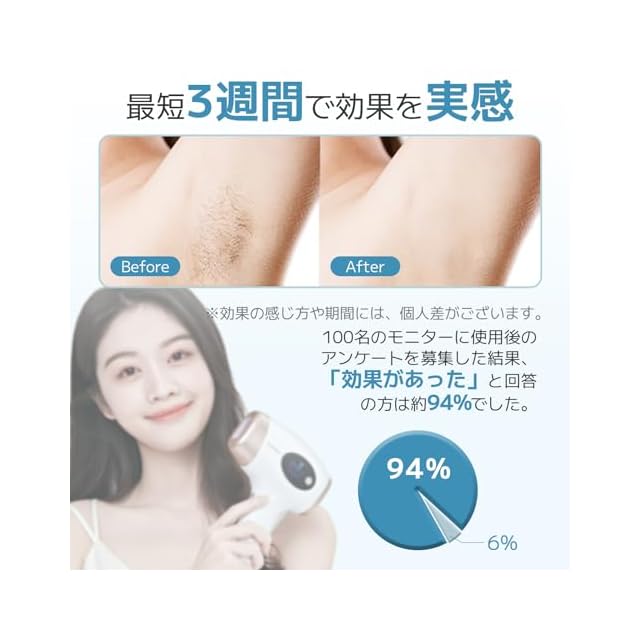 ❤個人的の肌質や使用部位によって、ムダ毛ケア効果と美顔効果が異なります。製品の使用寿命に影響を与えないよう、1日3回、1回30分以内の使用を推奨します。長時間連続使用すると、製品が過熱する原因になりますので、本体を1時間冷やした後にご使用ください。