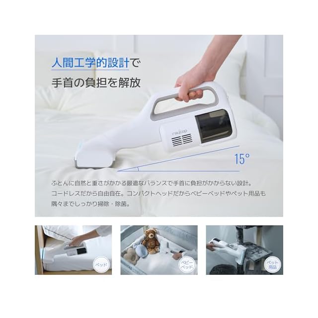 小型化したスマートヘッドと本体でふとんやベッドの端、ベビーベッドやペット用品などの隅々まで簡単に掃除&UV除菌。