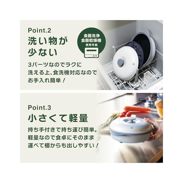 グリル部分は、ふっ素樹脂加工なので汚れが落ちやすく、食器洗浄機対応なのでお手入れも簡単。コンパクトサイズで、食卓にそのまま持ち運びしやすく、軽いので棚からの出し入れも簡単