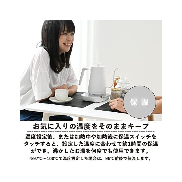 【温度調節】50~100℃の間で1℃単位で温度設定が出来るので、飲み物に合わせた最適温度でお湯を沸かせ、より美味しい飲み物が楽しめます。また、あらかじめ7種類の温度(50/60/70/80/85/90/95℃)もプリセットされております。