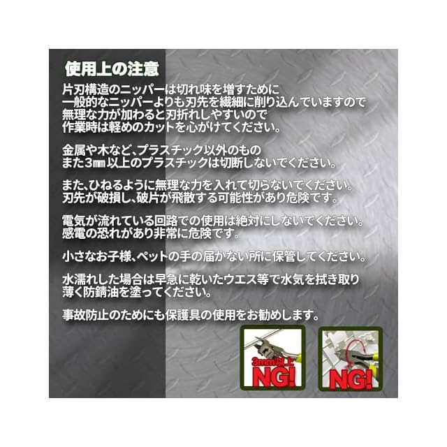 【片刃ニッパーまな刃について】 薄く研がれた切断刃の刃折れを防ぎ、スムーズに最後まで切るために 切断刃よりまな板刃がごく僅かに張り出した作りになっています。 不良などではなく商品の仕様であることをご理解ください ※切断刃を対象物に沿って切ることでほぼフラットに切ることが可能です